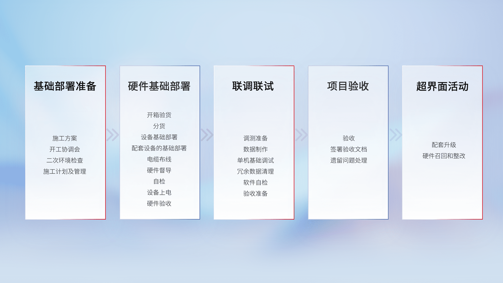 从基础部署准备、、、、硬件基础部署、、、联调联试、、项目验收、、、、越界面活动的全过程可追溯,,保证施工质量和进度。。。